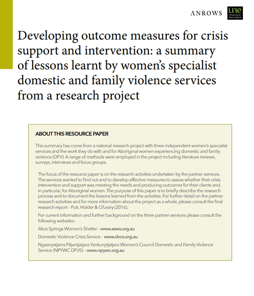 Developing outcome measures for crisis support and intervention: A summary of lessons learnt by women's specialist domestic and family violence services from a research project