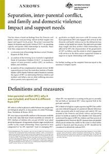 The project applied a mixed method approach incorporating: a literature review, a quantitative element using three existing, large-scale databases (the Longitudinal Study of Australian Children, the Longitudinal Study of Separated Families and the Survey of Recently Separated Parents 2012), and a qualitative element providing insight into the experiences of mothers who have used services across a range of areas in the context of a history of DFV.