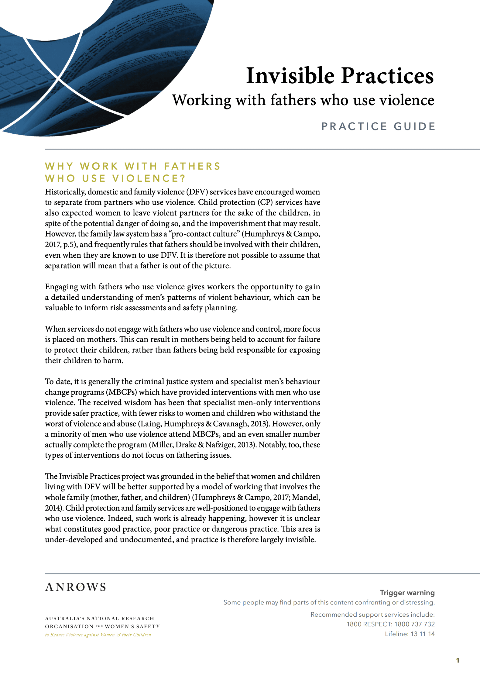 Healey, L., Humphreys, C., Tsantefski, M., Heward-Belle, S., Chung, D., & Mandel, D. (2018). Invisible Practices: Intervention with fathers who use violence: Key findings and future directions (Research to policy and practice, 04/2018). Sydney, NSW: ANROWS.