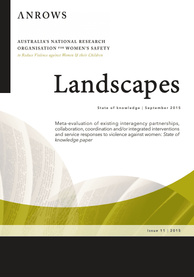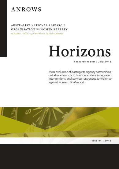 The first stage, a state of knowledge paper, presented current published literature on Australian and international partnerships, collaborations and integrated interventions regarding domestic and family violence and sexual assault. The second stage, the final report, is a meta-evaluation of Australian integrated responses, with recommendations for future evaluations and key considerations for integrated responses in terms of core elements, contexts and circumstances.